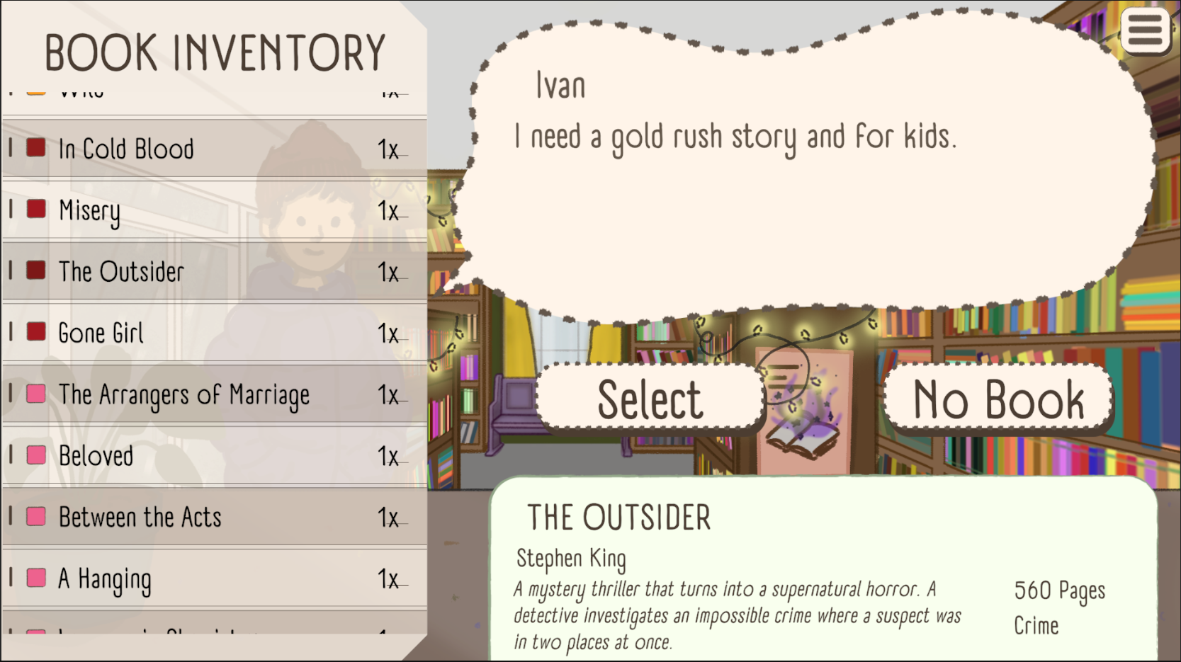 The heart of your shop beats in your massive library containing over a thousand unique works. But be careful; your customers won't always tell you exactly what they want directly. When faced with complex demands like "Give me an easy-to-read sci-fi, but absolutely no aliens," you must carefully examine the books' back-cover blurbs and guess their hidden tags (genre, vibe, length, complexity) to make the perfect match. Every flawless match skyrockets your shop's Reputation, while disappointing choices can lead to unhappy customers and tarnish your name.